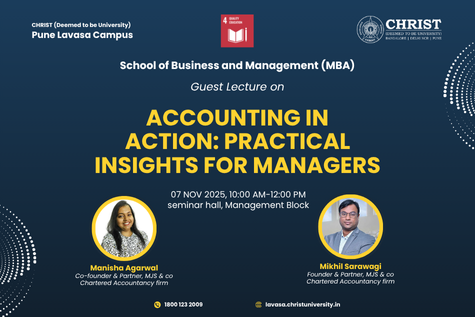 The School of Business and Management will be organizing a guest lecture session on “Accounting in Action: Practical Insights for Managers.” The session will be led by industry experts Mr. Mikhil Sarawagi and Ms. Manisha Agarwal, partners of MJS & Co., a reputed Chartered Accountancy firm. The session aims to provide MBA students with a deeper understanding of the practical applications of accounting in decision-making and business strategy. Drawing from their extensive professional experience, the speakers will demonstrate how accounting is not just about numbers but a critical tool for analysing performance, ensuring compliance, and driving organizational growth. Key topics will include interpreting financial statements, applying accounting concepts in managerial decisions, and understanding global accounting standards. Real-world case studies will be used to highlight how managers can leverage accounting insights to tackle challenges, evaluate opportunities, and create value for stakeholders. The interactive format of the session will encourage participants to clarify doubts, engage with practical scenarios, and connect theoretical concepts with business realities. By bridging academic knowledge with professional expertise, this session is designed to prepare students for managerial roles where financial acumen plays a vital part in success.