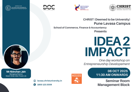 The School of Commerce, Finance and Accountancy, CHRIST (Deemed to be University), Pune Lavasa, is pleased to announce an interactive workshop on entrepreneurship development on 6 October 2025, titled “Idea 2 Impact.” This event is being organized under the aegis of the Institution’s Innovation Council (IIC) and the Alumni Association. The workshop will be facilitated by our distinguished alumnus, Mr. Akinchan Jain, Managing Director of Desert Wide India Private Ltd., a budding entrepreneur. The session is designed to help commerce students explore the process of converting ideas into workable solutions. Through short, practical, and engaging activities, participants will gain skills in identifying real-world problems, developing a clear value proposition, mapping target customers, and outlining a structured plan for business ideas. Drawing from his own entrepreneurial experiences, Mr. Jain will provide valuable insights and motivational guidance. The workshop aims to foster creativity, innovation, and an entrepreneurial mindset among students.