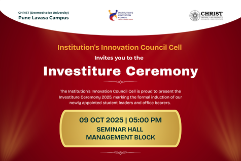 The Institution’s Innovation Council (IIC) Cell at CHRIST (Deemed to be University), Pune Lavasa Campus, proudly hosted its Investiture Ceremony 2025 on 9th October at 5:00 PM in the Seminar Hall, Management Block. This prestigious event marked the formal induction of newly appointed student leaders and office bearers who will drive innovation, entrepreneurship, and leadership initiatives throughout the academic year. The ceremony celebrated the commitment, vision, and dedication of students stepping into roles that will shape the campus innovation ecosystem. Faculty members, peers, and special guests gathered to witness this moment of pride and responsibility. The IIC Cell continues to empower students to become changemakers, fostering a culture of creativity, collaboration, and impact. This milestone event sets the stage for a year of dynamic leadership and forward-thinking initiatives aligned with the national innovation agenda.