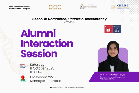 The School of Commerce, Finance & Accountancy, CHRIST (Deemed to be University), Pune Lavasa Campus, in collaboration with the Office of Alumni Engagement, organizing an insightful Alumni Interaction Session on 11 October 2025. The session will feature Ms. Mehreen Ashfaque Sayed, an alumna of the Department of Commerce and currently serving as an Executive – Revenue Management at AmberStudent, Pune. Through this interactive engagement, Ms. Mehreen will be sharing her professional journey, experiences, and valuable insights into the corporate world, emphasizing the importance of adaptability, communication skills, and continuous learning in achieving career success. This session aims to strengthen the connection between alumni and students while providing participants with a realistic understanding of industry expectations. Students will have the opportunity to engage with the speaker, ask questions, and gain practical perspectives that complement their academic learning. Through such initiatives, the university continues to promote experiential learning and foster lifelong relationships with its alumni.