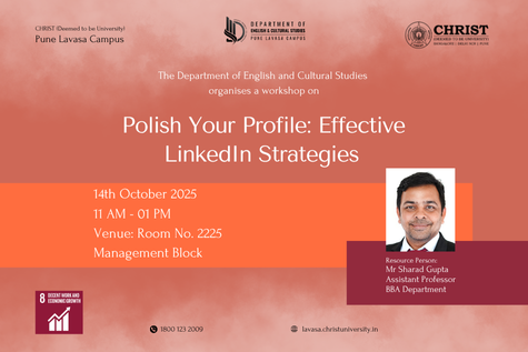 The Department of English and Cultural Studies is organising a workshop titled “Polish Your Profile: Effective LinkedIn Strategies”, conducted by Mr. Sharad Gupta, Assistant Professor, Department of Business Administration, CHRIST (Deemed to be University). The workshop aims to provide students with a comprehensive understanding of LinkedIn as an essential tool for professional growth, networking, and career advancement. Participants will learn to design compelling profiles, craft impressive summaries, and highlight their academic and extracurricular achievements effectively. The session will also cover strategies to engage with professional communities, follow industry trends, and use LinkedIn features to build visibility and credibility in the digital world. Mr. Gupta will guide participants in developing a distinct personal brand, identifying professional goals, and creating meaningful connections that can open doors to internships, collaborations, and future career opportunities. This interactive session seeks to empower students to represent themselves confidently, maintain digital professionalism, and leverage LinkedIn as a platform for lifelong learning and professional development