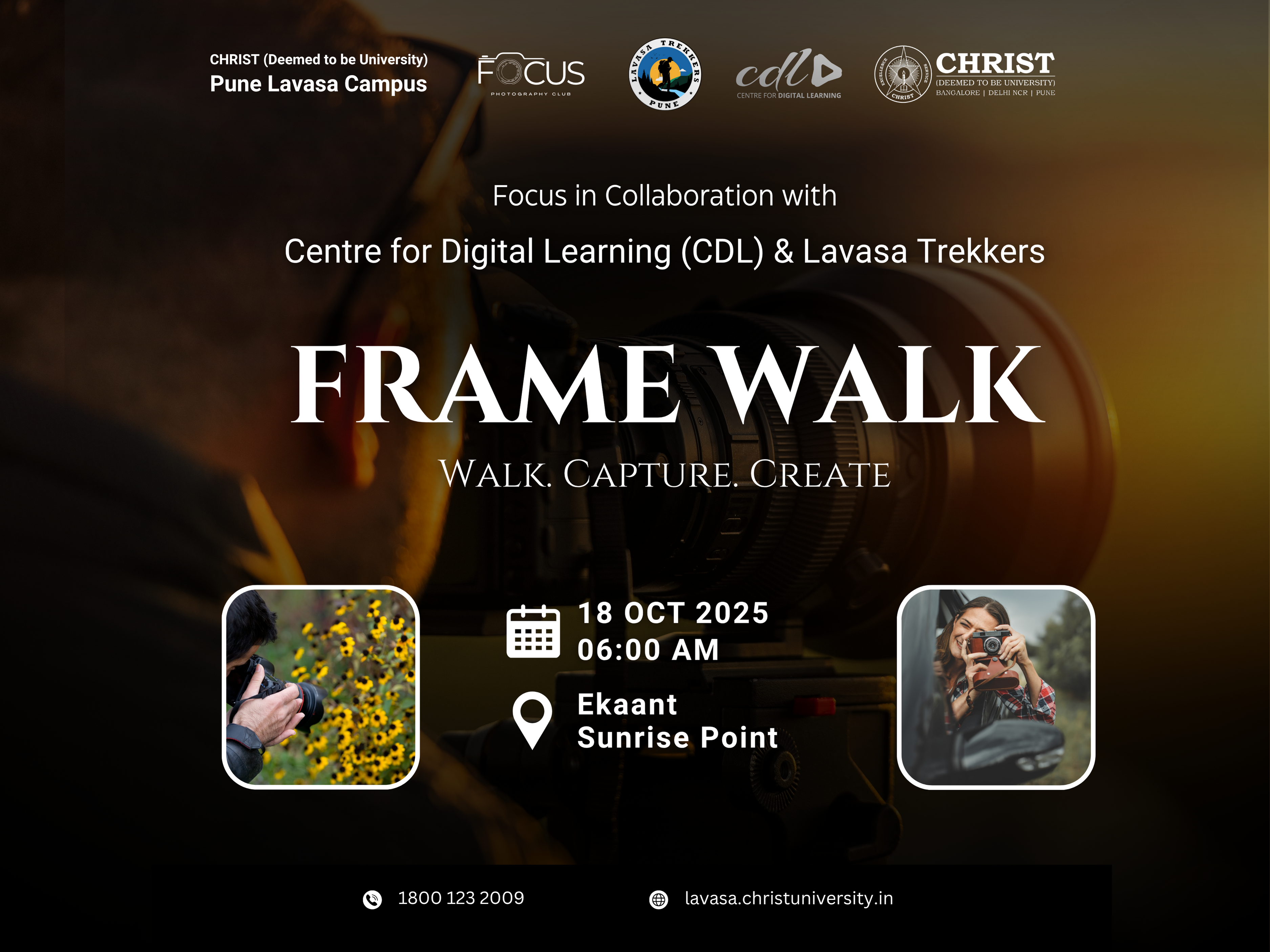 Focus, the Photography Club of CHRIST (Deemed to be University), Pune Lavasa Campus, in collaboration with the Centre for Digital Learning (CDL) and Lavasa Trekkers, presents Frame Walk—an immersive photography experience that blends creativity, exploration, and storytelling. Scheduled for 18 October 2025 at 6:00 AM at Ekaant Sunrise Point, this event invites participants to discover the art of capturing nature through a fresh lens. The walk offers an opportunity to explore scenic landscapes, experiment with light and composition, and enhance one’s visual storytelling skills in a serene outdoor setting. Whether you are a photography enthusiast or a nature lover, Frame Walk encourages you to pause, observe, and create meaningful frames that reflect your unique perspective. Join us for a morning of creativity, connection, and inspiration amidst Lavasa’s natural beauty.