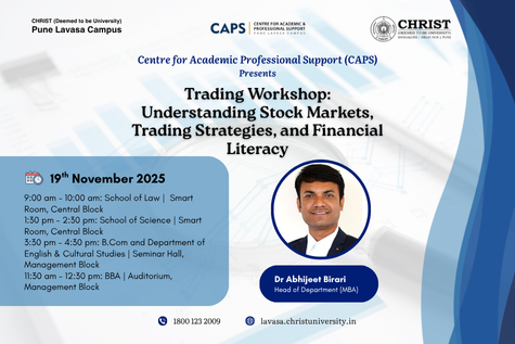 The Centre for Academic and Professional Support (CAPS), CHRIST (Deemed to be University), Pune Lavasa Campus, is organizing a Trading Workshop - Understanding Stock Markets, Trading Strategies, and Financial Literacy on 19th November 2025 as part of Athenora 2025. The session will be conducted by Dr. Abhijeet Birari, Head of the Department – MBA, CHRIST University, Pune Lavasa Campus. The workshop aims to equip students with a comprehensive understanding of stock markets, trading strategies, and the fundamentals of financial literacy. Through interactive discussions and practical insights, participants will gain exposure to the dynamics of trading and investment decision-making. The sessions will be held across various departments, including the School of Law, School of Science, B.Com, Department of English & Cultural Studies, and BBA, providing students from diverse disciplines the opportunity to develop essential financial skills and awareness of the global economic landscape. This guest lecture aims to introduce students to the fundamentals of academic research, emphasizing the importance of systematic inquiry, research design, and scholarly writing. Dr. Gupta will guide students through the initial stages of developing a research idea, selecting methodologies, and understanding the ethics of scholarly work. The sessions will be held for the School of Sciences, School of Law, BBA, and B.Com students, fostering research curiosity and academic rigor among emerging scholars.