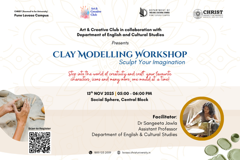The Art & Creative Club, in collaboration with the Department of English and Cultural Studies, is organising a Clay Modelling Workshop titled “Sculpt Your Imagination.” This creative session invites students to step into the world of art, expression, and craftsmanship. Participants will get the opportunity to explore the art of clay modelling, shaping and designing their favourite characters, icons, and abstract forms with their own hands. The workshop will be facilitated by Dr Sangeeta Jawla, Assistant Professor, Department of English and Cultural Studies, who will guide participants through the creative process, encouraging imagination and experimentation. Join us on 13th November 2025, from 5:00 PM to 6:00 PM at the Social Sphere, Central Block, to experience the joy of creating and shaping ideas into tangible art forms. This interactive session promises a relaxing and inspiring artistic experience for all participants.