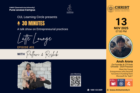 The CUL Learning Circle, under the aegis of the Teaching Learning Enhancement Cell (TLEC), CHRIST (Deemed to be University), Pune Lavasa Campus, organized Latte Lounge – Episode #03, a 30-minute interactive talk show on Entrepreneurial Practices, on 13 November 2025 at 7:00 PM. The session was hosted by Pallavi and Rishik and featured Mr. Ansh Arora, Co-Founder and CTO of bob, and a 2024 graduate of CHRIST (Deemed to be University). Mr. Arora, a young and dynamic entrepreneur, shared his inspiring journey of innovation and perseverance that led to securing ₹3 Crores in funding from Microsoft for his startup, bob. During the conversation, he spoke about the challenges faced in the startup ecosystem, the importance of building a strong team, and how continuous learning fuels entrepreneurial growth. The hosts guided the dialogue in a lively and engaging manner, allowing students to gain real-world insights into the entrepreneurial mindset and the process of transforming ideas into successful ventures. The episode concluded with an interactive Q&A, where students enthusiastically interacted with the guest. The event successfully encouraged participants to embrace creativity, resilience, and leadership in their professional pursuits.