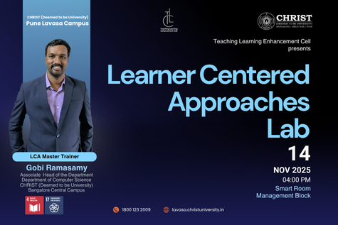 The Teaching Learning Enhancement Cell (TLEC), CHRIST (Deemed to be University), Pune Lavasa Campus, organized a session titled “Learner Centered Approaches Lab” on 14 November 2025 at 4:00 PM in the Smart Room, Management Block. The session was conducted by Mr. Gobi Ramasamy, Associate Head of the Department, Department of Computer Science, CHRIST (Deemed to be University), Bangalore Central Campus. The objective of the session was to promote innovative, learner-centric pedagogical techniques that enhance student engagement and foster self-directed learning. Mr. Ramasamy emphasized the importance of shifting focus from traditional teacher-centered instruction to approaches that encourage collaboration, reflection, and critical thinking. He demonstrated various learner-centered strategies, including active learning, project-based activities, and reflective practices that align with the institutional goal of promoting quality education. Faculty members actively participated in the interactive discussion, sharing their classroom experiences and exploring adaptable strategies suitable for diverse learning environments. The session concluded with an open Q&A, providing valuable insights into the practical implementation of learner-centered methods. Overall, the Learner Centered Approaches Lab served as an enriching platform for educators to refine their teaching methodologies and reinforce CHRIST University’s commitment to continuous teaching excellence.