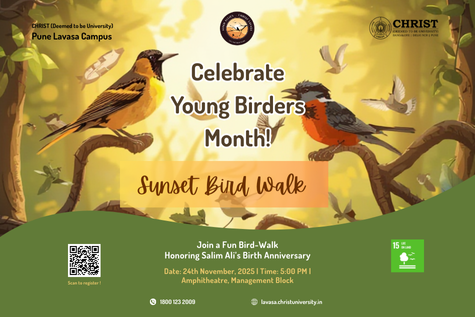 Open to all faculty members, admin staff, students, and bird enthusiasts. Avian Allies is the Birders’ Club of CHRIST (Deemed to be University), Pune Lavasa campus. It aims to create awareness and appreciation for the avian diversity in and around the campus through interactive bird walks, expert talks, and conservation-themed workshops. The Sunset Bird Walk is designed to help participants explore the rich birdlife at the lakeside. Scheduled for 24th November 2025 at 5:00 PM, this guided walk invites participants to observe birds, listen to their calls, and discover hidden winged wonders. To enhance the experience, participants are encouraged to download the Merlin Bird ID App, which makes bird identification simple and fun. Bring binoculars if you have them—if not, we’ve got you covered. Participants can also carry a notebook or camera to record their observations. This walk promises to be a refreshing start to the day, blending learning with the joy of reconnecting with nature.