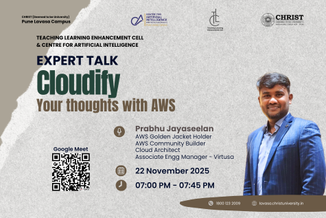 The Teaching Learning Enhancement Cell (TLEC) and the Centre for Artificial Intelligence at CHRIST (Deemed to be University), Pune Lavasa Campus, organized an expert talk titled “Cloudify Your Thoughts with AWS” on 22 November 2025. The session featured Mr. Prabhu Jayaseelan, an accomplished AWS Golden Jacket Holder, AWS Community Builder, Cloud Architect, and Associate Engineering Manager at Virtusa. The 45-minute session, conducted through Google Meet, provided valuable insights into cloud adoption, AWS services, and the importance of cloud-native thinking in modern computing environments. The speaker shared practical use cases, industry best practices, and strategies for leveraging AWS tools to enhance scalability, reliability, and innovation. Faculty members and participants gained a deeper understanding of emerging cloud trends and the skills required for effective cloud integration in academic and industry contexts. The session proved enriching and aligned with the university’s vision for technology-enhanced learning.