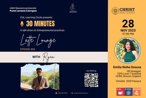 The CUL Learning Circle of CHRIST (Deemed to be University), Pune Lavasa Campus, is hosting the fourth episode of its talk show series Latte Lounge – 30 Minutes, focused on entrepreneurial practices. The session is scheduled for 28 November 2025 at 7:00 PM. This episode features Emilia Nisha Dsouza, an accomplished HR Strategist with CIPD Level 7 qualification from HCRG, Runcon, England, and a proud Christite from the 2020 batch. Her professional expertise and international exposure position her as an inspiring resource person for students and budding entrepreneurs. The episode will be hosted by Ryan, who brings a dynamic presence to the conversation. The talk aims to provide insights into practical aspects of entrepreneurship, leadership, career development, and HR-driven innovation. It also supports the university’s commitment to quality education and industry partnership, aligning with global goals such as SDG 4 and SDG 17. The event reflects the Teaching Learning Enhancement Cell’s ongoing efforts to create meaningful learning engagements for students. A QR code is provided on the poster for easy access to the meeting link, along with the campus helpline number for queries. This interactive session is expected to enrich participants with valuable knowledge and real-world perspectives.