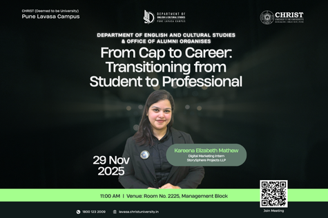 The Department of English and Cultural Studies, in collaboration with the Office of Alumni, is organising “From Cap to Career: Transitioning from Student to Professional”, an insightful session aimed at guiding students as they step from academia into the professional world. This event will provide practical strategies, industry insights, and actionable advice for building a successful career post-graduation. Our alumni speaker, Kareena Elizabeth Mathew, a Digital Marketing Intern at StorySphere Projects LLP, will share her journey, highlighting the skills, mindset, and networking approaches essential for a smooth transition from student life to professional environments. Participants will gain valuable tips on leveraging their academic experiences, enhancing employability, and navigating the challenges of the modern workplace. This interactive session encourages students to engage directly, ask questions, and learn from real-world experiences, equipping them with the confidence and knowledge to embark on their career paths effectively.