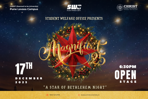 Magnificat, hosted by CHRIST (Deemed to be University), Pune Lavasa Campus, is a vibrant expression of joy, unity, and the spirit of giving. Organised by the Student Welfare Office in collaboration with the Association of Christian Christites, Magnificat 2025 brings together students, faculty, and the campus community for an evening filled with festive performances, heartfelt reflections, and the warmth of togetherness. This year’s theme, “A Star of Bethlehem Night,” captures the essence of guidance, hope, and new beginnings. The celebration features soulful carols, creative performances, cultural showcases, and a beautifully curated nativity experience that highlights the true meaning of Christmas. Magnificat is more than an event, it is a moment for the CHRIST family to come together, celebrate diversity, and share the joy of the season. Join us on 17 December 2025 at 6:30 PM at the Open Stage for an unforgettable Christmas evening illuminated by love and fellowship.