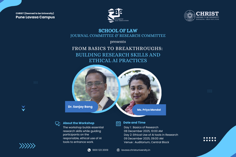 The School of Law, CHRIST University, Lavasa, through its Journal Committee in collaboration with the Research Committee, is organising a two-day workshop titled “From Basics to Breakthroughs: Building Research Skills and Ethical AI Practices.” Scheduled for 08 and 09 December 2025, the workshop is designed to strengthen the research capabilities of students while fostering responsible and informed academic inquiry. Day One introduces participants to the fundamentals of research, guiding them through the process of framing issues, gathering credible sources, and developing coherent arguments. Day Two focuses on the ethical use of AI tools in research, emphasising academic integrity, transparency, and the appropriate application of technology within scholarly work. By integrating foundational research training with contemporary discussions on AI ethics, the workshop aims to prepare students to engage with academic writing thoughtfully and responsibly. It reflects the commitment of the committees to nurture a culture of rigorous, principled, and forward-looking research within the School of Law."