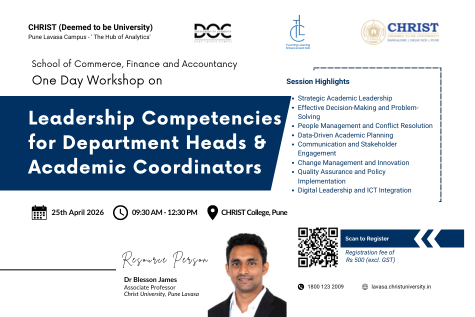 The School of Commerce, Finance and Accountancy, CHRIST (Deemed to be University), Pune Lavasa Campus, presents a One-Day Workshop on Leadership Competencies for Department Heads & Academic Coordinators, aimed at strengthening academic leadership and institutional effectiveness. This workshop focuses on building strategic leadership capabilities essential for academic administrators. Key areas include strategic academic leadership, effective decision-making and problem-solving, people management and conflict resolution, data-driven academic planning, communication and stakeholder engagement, change management, quality assurance, policy implementation, and digital leadership with ICT integration. The session will be facilitated by Dr Blesson James, Associate Professor, CHRIST University, Pune Lavasa, who brings extensive experience in academic administration, leadership development, and institutional planning. The workshop offers practical tools, real-world insights, and reflective discussions to support academic leaders in navigating complex academic environments and driving sustainable institutional growth. This programme is highly relevant for current and aspiring academic leaders across higher education institutions.