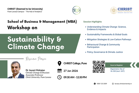 The School of Business & Management (MBA), CHRIST (Deemed to be University), Pune Lavasa Campus, in collaboration with the SDG Cell, is pleased to offer a focused workshop on Sustainability & Climate Change. This workshop is designed to deepen participants’ understanding of climate science, global sustainability frameworks, and the multifaceted impacts of climate change on society, economy, and governance. The session will explore key themes such as climate evidence and impacts, sustainability frameworks and global goals, mitigation strategies and low-carbon pathways, behavioural change, community participation, and climate justice. Through an interdisciplinary approach, participants will gain practical insights into how sustainability principles can be integrated into policy, business decisions, and community initiatives. The workshop will be led by Dr Jayant Mahajan, Associate Professor, CHRIST University, Pune Lavasa, who brings strong academic engagement and applied perspectives on climate change. This session is ideal for students, faculty members, researchers, and professionals interested in sustainability and responsible leadership.