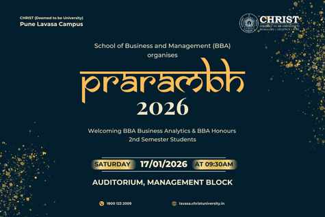 The School of Business and Management (BBA) is pleased to welcome its first-year BBA students to Prarambh 2026, the inaugural ceremony that marks the formal commencement of their undergraduate academic journey to the second semester of the BBA Programme. The ceremony is scheduled on 17 January 2026 at 9:30 AM at the Auditorium, Management Block. This event symbolizes a meaningful beginning filled with learning, aspirations, and new opportunities. Prarambh represents the transition of students into a vibrant academic community that emphasizes excellence, discipline, ethical values, and holistic development. The ceremony is designed to orient students to the academic culture of the institution, inspire them to pursue knowledge with curiosity and commitment, and encourage them to develop leadership and collaborative skills essential for the evolving business environment. With the guidance of faculty, mentors, and peers, the event sets the tone for a purposeful and enriching academic journey, motivating students to confidently embark on their path toward personal and professional growth