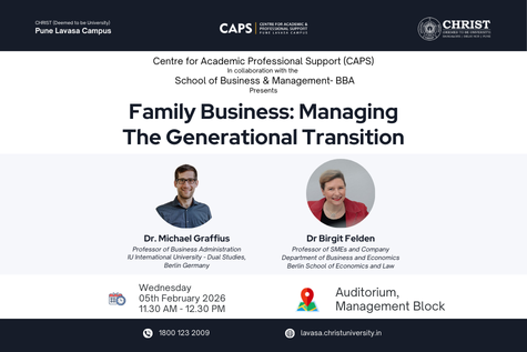Family-owned enterprises play a vital role in the global and Indian economy; however, managing leadership transitions across generations remains one of their most critical challenges. This session aims to provide students with a deeper understanding of succession planning, governance structures, and the strategic decisions involved in sustaining family businesses over time. The programme encourages analytical thinking, professional awareness, and academic enrichment among students. The session will be led by distinguished international academicians Dr. Michael Graffius, Professor of Business Administration at IU International University, Berlin, and Dr. Birgit Felden, Professor of SMEs and Company Development at the Berlin School of Economics and Law. Through expert insights and practical perspectives, participants will gain valuable exposure to real-world family business dynamics.