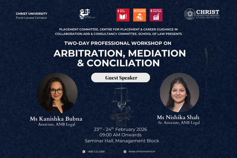The School of Law at Christ(deemed to be) University, Pune Lavasa Campus, in collaboration with the Placement Committee and the ADR & Consultancy Committee, is proud to present a Two-Day Professional Workshop on Arbitration, Mediation & Conciliation. Scheduled for 23rd–24th February 2026, from 9:00 AM onwards at the Seminar Hall, Management Block, this workshop is designed to provide participants with practical insights into alternative dispute resolution mechanisms. The sessions will be conducted by distinguished practitioners from ANB Legal. Ms. Kanishka Bubna, Associate, and Ms. Nishika Shah, Senior Associate. With their extensive experience in dispute resolution, they will guide participants through procedural nuances, drafting techniques, strategy building, and emerging trends in ADR. This workshop aims to bridge the gap between theory and practice, equipping students with essential skills for a dynamic legal career in arbitration and mediation. Participants will gain hands-on exposure, professional insights, and certification upon successful completion."