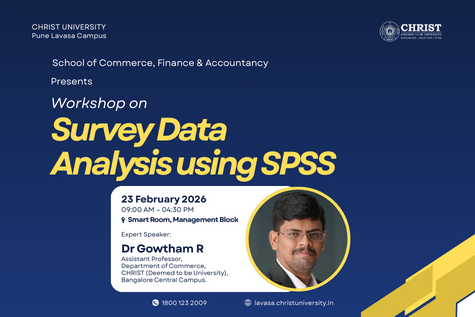 In the rapidly evolving world of academic and corporate research, the ability to interpret raw data is a critical skill. On February 23, 2026, the School of Commerce, Finance & Accountancy at CHRIST (Deemed to be University), Pune Lavasa Campus, hosted an intensive workshop titled "Survey Data Analysis using SPSS" Led by Dr. Gowtham R, Assistant Professor from the Bangalore Central Campus, Chrsit University.The session was designed to demystify the complexities of the Statistical Package for the Social Sciences (SPSS). The workshop bridged the gap between theoretical research methodology and practical application, guiding students through the nuances of data entry, cleaning, and advanced statistical testing. By providing hands-on training in the Smart Room, the event ensured that participants didn't just learn about the tools, but actively applied them to real-world survey data. This initiative underscores the department's commitment to fostering a strong research culture and equipping students with the analytical competence required for high-level dissertation work and industry roles.