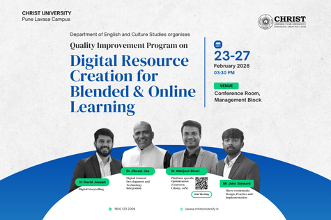 The Department of English and Culture Studies is organising a Quality Improvement Program on Digital Resource Creation for Blended & Online Learning from February 23 to 27, 2026. The program focuses on equipping participants with skills to create digital content for online and blended learning environments. Expert sessions include Digital Storytelling, Digital Content Development, Platform-specific Optimization, and Micro-credentials: Design, Practice and Implementation. The sessions will be held at 3:30 PM in the Conference Room, Management Block, and will feature resource persons Dr. Jibrael Jos, Dr. David Joseph, Dr. Abhijeet Birari, and Mr. John Steward. The event aims to enhance skills in digital resource creation.