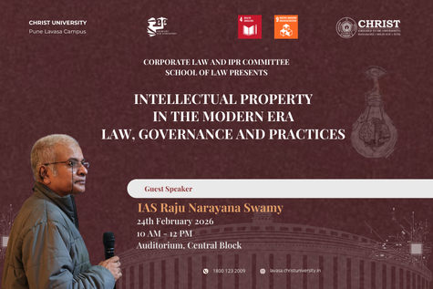 The School of Law, CHRIST (Deemed to be University), Pune Lavasa Campus, through its Corporate Law and IPR Committee, is organizing a Guest Lecture on “Intellectual Property in the Modern Era: Law, Governance and Practices” on 24th February 2026 at the Central Block Auditorium. The session is being delivered by distinguished civil servant IAS Raju Narayana Swamy, who is sharing insights on the evolving landscape of intellectual property law in the context of technological advancement, digital innovation, and governance challenges. He is discussing the importance of strong regulatory frameworks, effective enforcement, and ethical governance in strengthening India’s intellectual property system. Students are actively participating in the session and engaging in meaningful discussions on contemporary IP issues and emerging trends. The lecture is providing them with an opportunity to understand how intellectual property law operates not only in theory but also in real-world administrative and policy settings