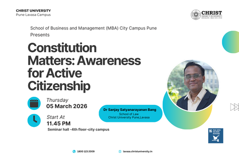 The School of Business and Management (MBA), City Campus Pune, is organizing an insightful awareness program titled “Constitution Matters: Awareness for Active Citizenship” on 5th March from 11:45 AM to 1:45 PM at Seminar Hall, 4th Floor, City Campus. The session will be delivered by Dr. Sanjay Satyanarayanan Bang from the School of Law, Christ University, Pune Lavasa. This program is designed to strengthen constitutional literacy among management students and highlight the importance of active and informed citizenship in a democratic society. In an era marked by rapid socio-economic transformation, understanding constitutional values, fundamental rights, duties, and governance structures is essential for future leaders and professionals. The session will encourage students to critically engage with constitutional principles and explore their relevance in business ethics, public policy, and responsible leadership. By fostering awareness and civic responsibility, the initiative aims to nurture socially conscious managers who contribute meaningfully to nation-building and democratic participation.