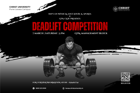 The Department of Physical Education & Sports at Christ University, Pune Lavasa Campus, in collaboration with the Gym Club, is organizing an exciting Deadlift Competition on 7 March 2026 (Saturday) at 5:00 PM in the university gymnasium. This event aims to promote strength training, fitness culture, and competitive spirit among students. The competition is open to both men and women, providing an opportunity for participants to showcase their power, technique, and determination in one of the most fundamental strength exercises in weight training. Participants will compete to achieve the highest successful lift under the supervision of trained officials and according to standard safety guidelines. Attractive prizes will be awarded to the winners, encouraging students to push their limits and demonstrate excellence in strength sports. Students interested in participating can register through the provided QR code. Join us for an evening of strength, energy, and sportsmanship at Christ University