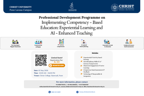 The Teaching and Learning Enhancement Cell (TLEC) is organizing the Professional Development Programme titled “Implementing Competency-Based Education: Experiential Learning and AI-Enhanced Teaching” on May 2, 2026, at Christ College, Ramwadi, Pune, from 10:00 AM to 04:00 PM. This programme explores the evolution of modern pedagogy through emerging technologies and active learning approaches. It is structured around key modules focusing on experiential learning, interdisciplinary skills, and the development of 21st-century competencies. Emphasis is placed on constructivist practices, including flipped classrooms and peer learning, to enhance student engagement. A significant component addresses the responsible use of generative AI tools for lesson planning and performance-based assessment. By integrating traditional teaching with AI-enhanced strategies, the programme offers a practical framework for competency-based feedback and assessment in contemporary educational settings.